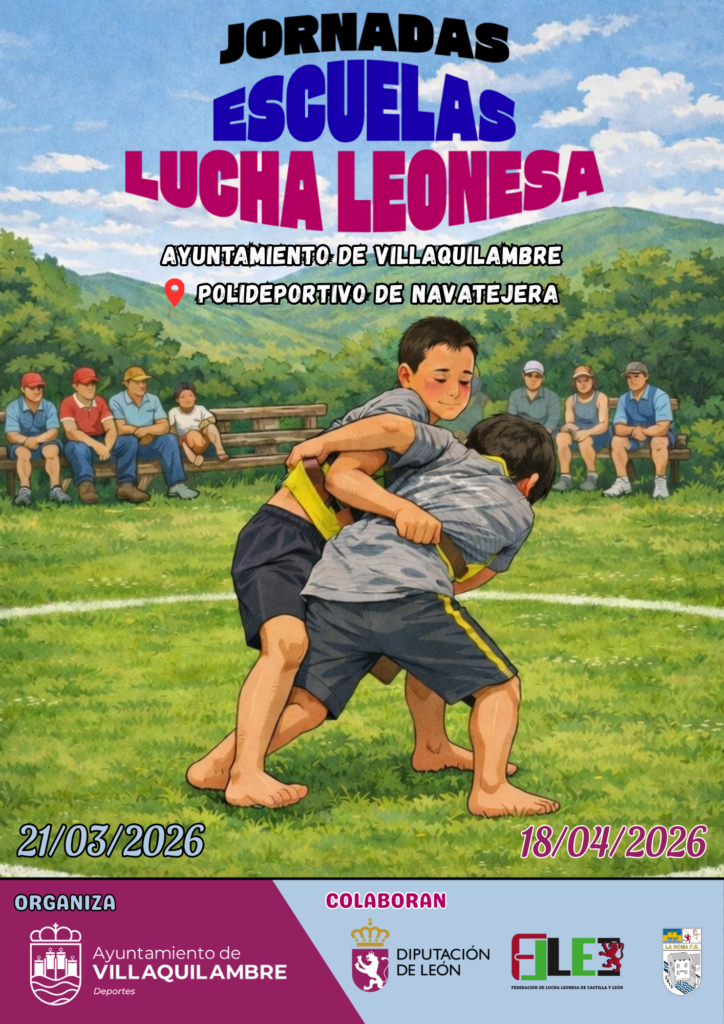 Los días 21/03/2026 y 18/04/2026, de 10:00 a 14:00 el Ayuntamiento de Villaquilambre organiza las jornadas de escuelas de lucha leonesa en el Polideportivo de Navatejera, con la siguiente programación: Calentamiento (15’).10:15-10:30 Inicialmente se procederá a un calentamiento conjunto guiado por los monitores de la escuela anfitriona. Juegos de enseñanza (15’). 10:30-10:45 Se continuará con una serie de juegos de lucha por categorías (pre/ benjamines, alevines, infantiles y cadetes/juveniles) a elección de los monitores anfitriones según su modo de entrenamiento habitual. Estaciones técnicas (45´). 10:45-11:30 Aprovechando la anterior clasificación por categorías se practicarán diferentes mañas/técnicas, incluyendo las más peligrosas para cadetes/juveniles si hubiera colchonetas quitamiedos. Almuerzo (30’). 11:30-12:00 Descanso para reponer fuerzas con el avituallamiento del Ayto. organizador, o si no lo hubiere, del propio de cada uno. Combates (1h15). 12:00-13:15 Dependiendo de los tatamis disponibles, y según el cuadro programado con líneas de ganadores y perdedores, los participantes lucharán un mínimo de 3 combates. Duración Combate 1 minuto y 30 segundos. De manera excepcional se podría unir categorías si no hay numero suficiente de participantes. Ejemplo Anexo II Obsequios (15’).13:15-13:30 Al finalizar se procederá a entregar los obsequios proporcionados por el organizador. #deportesvq #vqdxt #villaquilambre