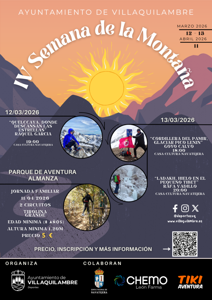 Los días 12, 13 de marzo y 11 de abril de 2026 el Ayuntamiento de Villaquilambre organiza la cuarta edición de este evento dedicado a la montaña. Este año contamos con tres charlas-proyecciones en el salón de actos de la Casa de Cultura de Navatejera y dos actividades en exterior. JUEVES 12/03/2026 – 19:00: RAQUEL GARCÍA “Quelccaya, donde descansan las estrellas”. Viernes 13/03/2026 – 18:00: GOYO CALVO “Cordillera del Pamir, glaciar pico Lenin”. Viernes 13/03/2026 – 20:00: RAFA VADILLO “Ladakh, hielo en el pequeño Tibet”. Sábado 11/04/2026: PARQUE DE AVENTURA DE ALMANZA 2 Circuitos y tirolina grande. Edad mínima 8 años y altura mínima 1,20m. PRECIO: 5 euros (Incluye seguro, transporte y monitores) Pago por bizum al 617176644 después con la inscripción. INSCRIPCIONES: HASTA EL 8 DE ABRIL A LAS 12:00 www.villaquilambre.es (Plazas limitadas Mín.10 Máx. 40). HORA SALIDA Y LUGAR: 9:00 AYUNTAMIENTO DE VILLAQUILAMBRE. HORA APROXIMADA DE LLEGADA: 14:45 LLEVAR ROPA DEPORTIVA Y DE ABRIGO, AGUA O BEBIDA Y ALGO PARA COMER O PICAR A MEDIA MAÑANA. Mas información en deportes@villaquilambre.es Colaboran la Junta Vecinal de Navatejera, Chemo Leon Farma y Tiki Aventura #deportesvq #vqdxt #villaquilambre FORMULARIO DE INSCRIPCIÓN