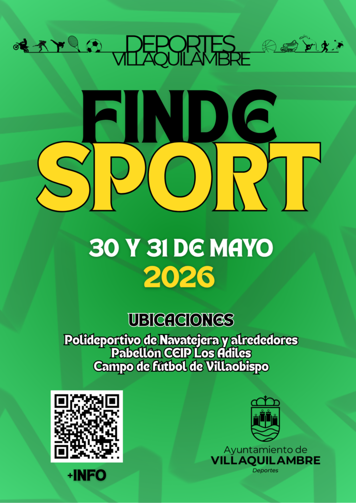 El “FINDE SPORT” es evento ya consolidado en nuestra programación deportiva municipal en la que se desarrollan actividades, juegos, clases abiertas, talleres, exhibiciones, partidos y competiciones relacionados con el mundo del deporte por clubes deportivos y asociaciones juveniles del municipio con convenios en vigor como punto final al curso escolar deportivo Este evento sirve para clausurar la temporada deportiva y juvenil, mostrar a los familiares, vecinos y amigos lo que se ha aprendido todo el curso deportivo, incluso dejando probar un deporte o actividad de ocio, tiempo libre o juvenil de cara a captarlos para el curso que viene. FINDESPORT 2026!!! Próximamente, os presentaremos la planificación del FindeSport 2026 que se desarrollará los días 30 Y 31 de mayo en el Ayuntamiento de Villaquilambre para mostrar el trabajo realizado por nuestros clubes deportivos y colaboradores. Todos aquellos que queráis acercaros a ver y participar en las actividades de nuestras escuelas deportivas municipales. Las actividades con «A» son actividades abiertas a todo el mundo para ver y participar en ellas y las actividades con «C» son exhibiciones o competiciones para ver. Como fin de temporada y de fin de semana se celebra la Gala de los Premios del Deporte del Ayuntamiento de Villaquilambre 2026. MÁS INFORMACIÓN SOBRE LOS PREMIOS DEL DEPORTE HACIENDO CLIC AQUÍ