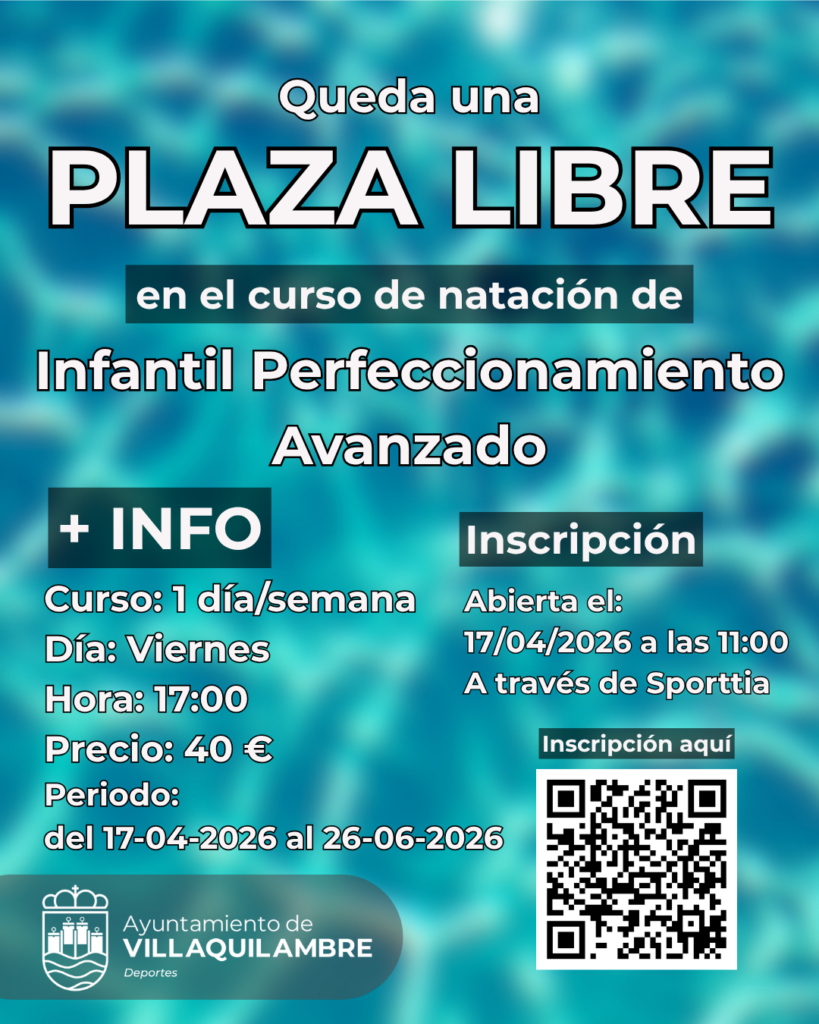 MAÑANA día 17-04-2026 a las 11:00, se abre la INSCRIPCIÓN para una plaza libre en el curso de natación de infantil perfeccionamiento avanzado, en horario de viernes a las 17:00 (1 día/semana). El precio será de 40 € y el usuario comenzará el curso de inmediato, ese mismo día 17-04-2026, finalizando el curso el día 26-06-2026. La inscripción se realizará a través del QR o en la app de Sporttia (https://play.sporttia.com/center/3065/activity/84425 ). #deportesvq #villaquilambre #vqdxt #polideportivonavatejera